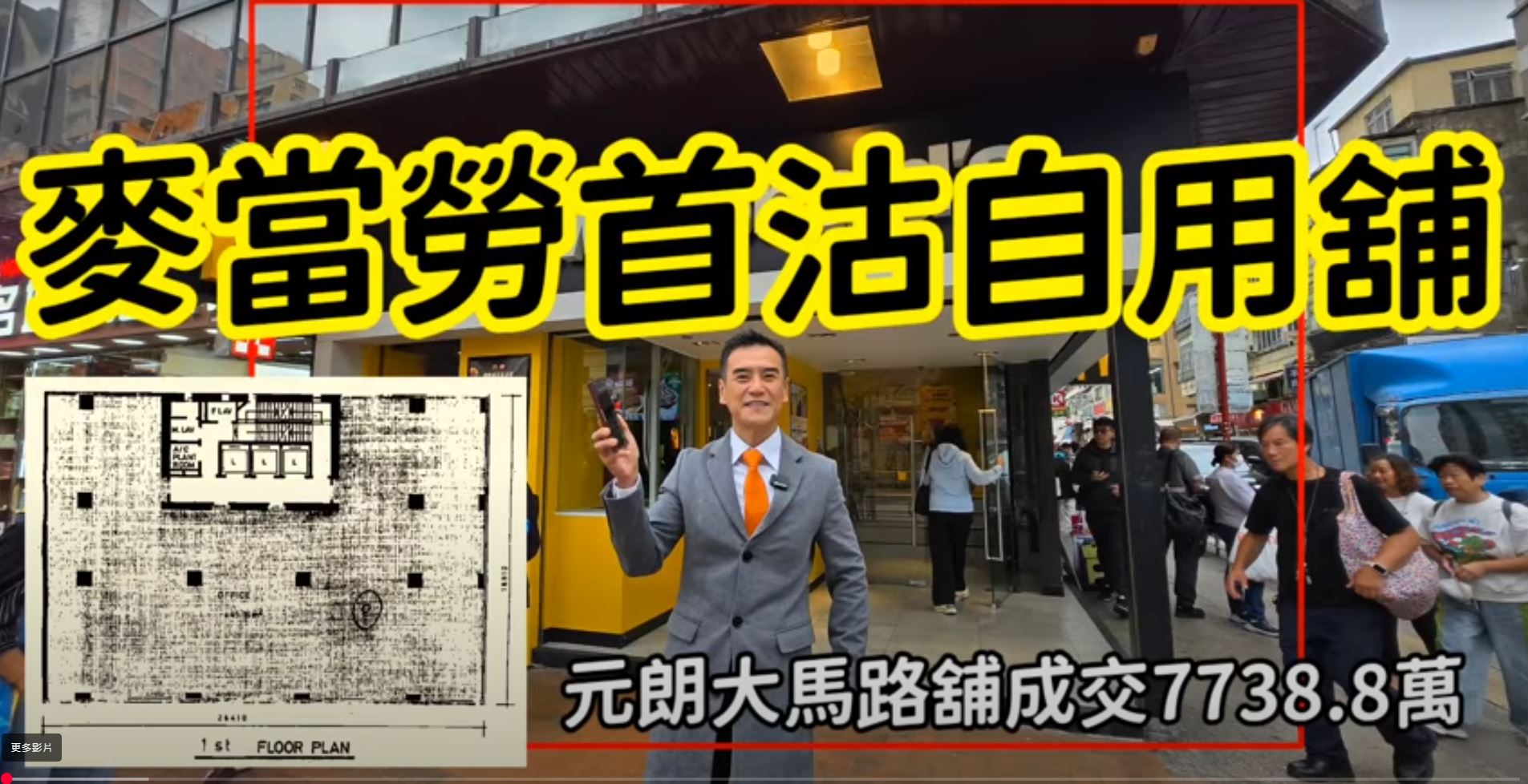 今次沽出這間舖是麥當勞沽出首間自用舖,之前都是收租的。 上次招標是2025年9月16號截標, 剛註冊沽出這間舖。 這間舖位於大馬路及福康街大單邊, 對面是大棠路輕鐵站,是元朗核心位置,大流極旺。 麥當勞已在此舖經營超過38年,現在是24小時營業。 二樓正在裝修中, 穩定收租,回報唔錯,絕對是靚舖!